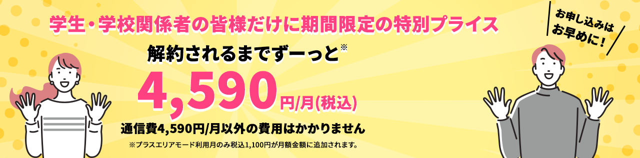 税込4,590円は固定ですが、消費税率の変更、ユニバーサル接続料、電話リレーサービス料などの増減で変わる可能性はございます。 またプラスエリアモードを利用した月は税込1,100円が月額金額に追加されます。